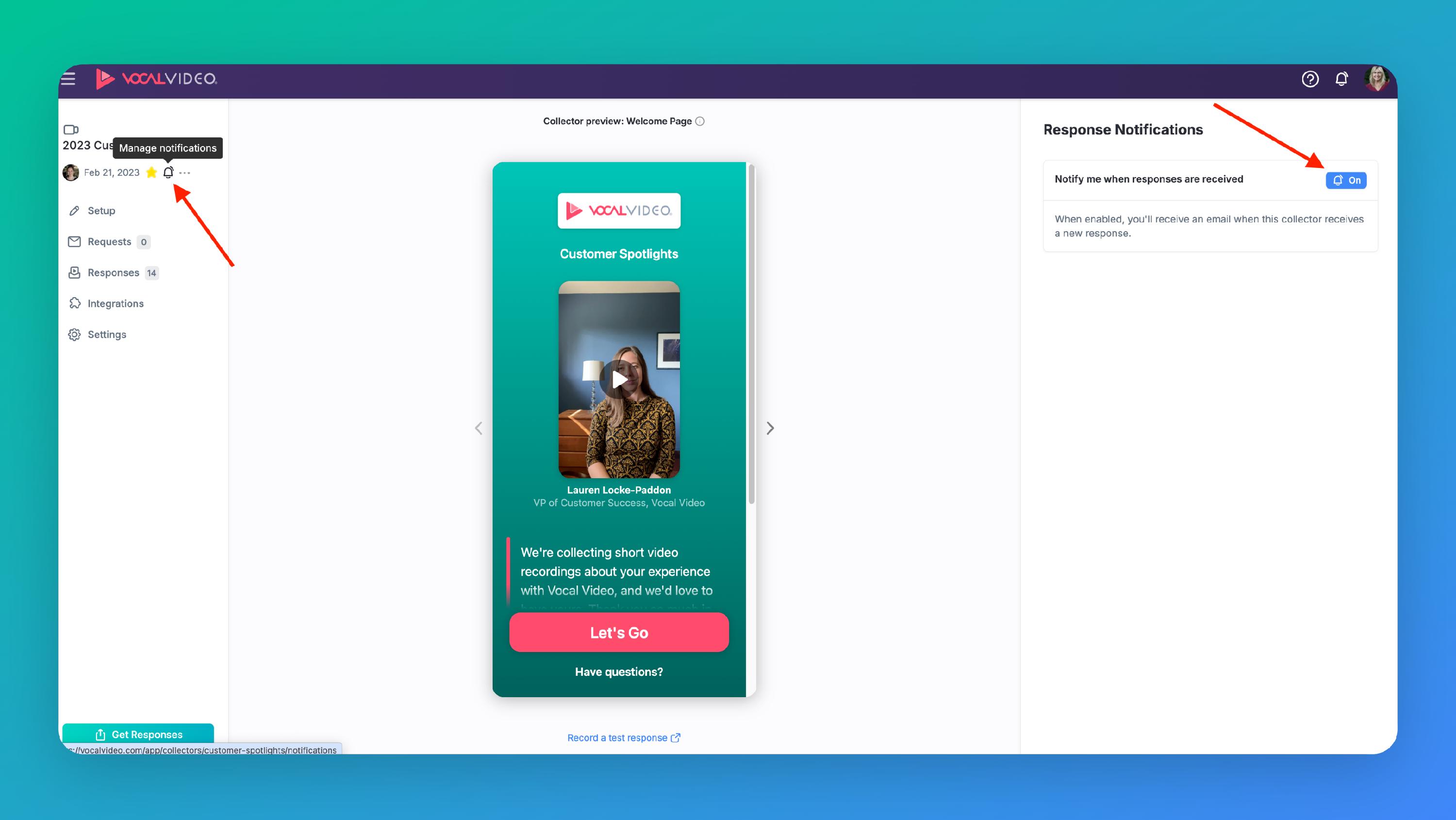 When you create a video collector, you'll automatically receive an email notification when a new response is received. But what if you want to receive response notifications on a video collector you didn't create? You can!