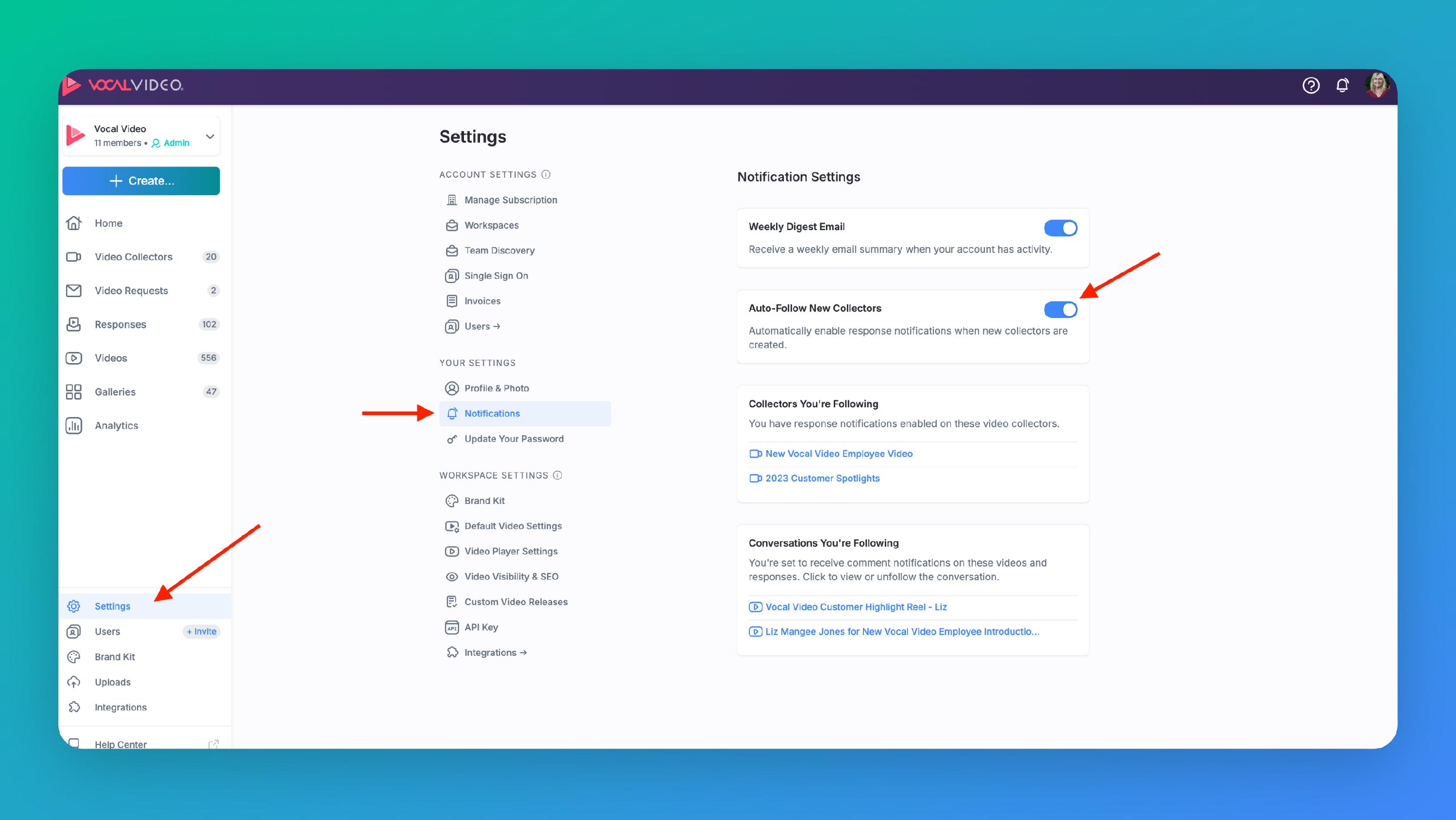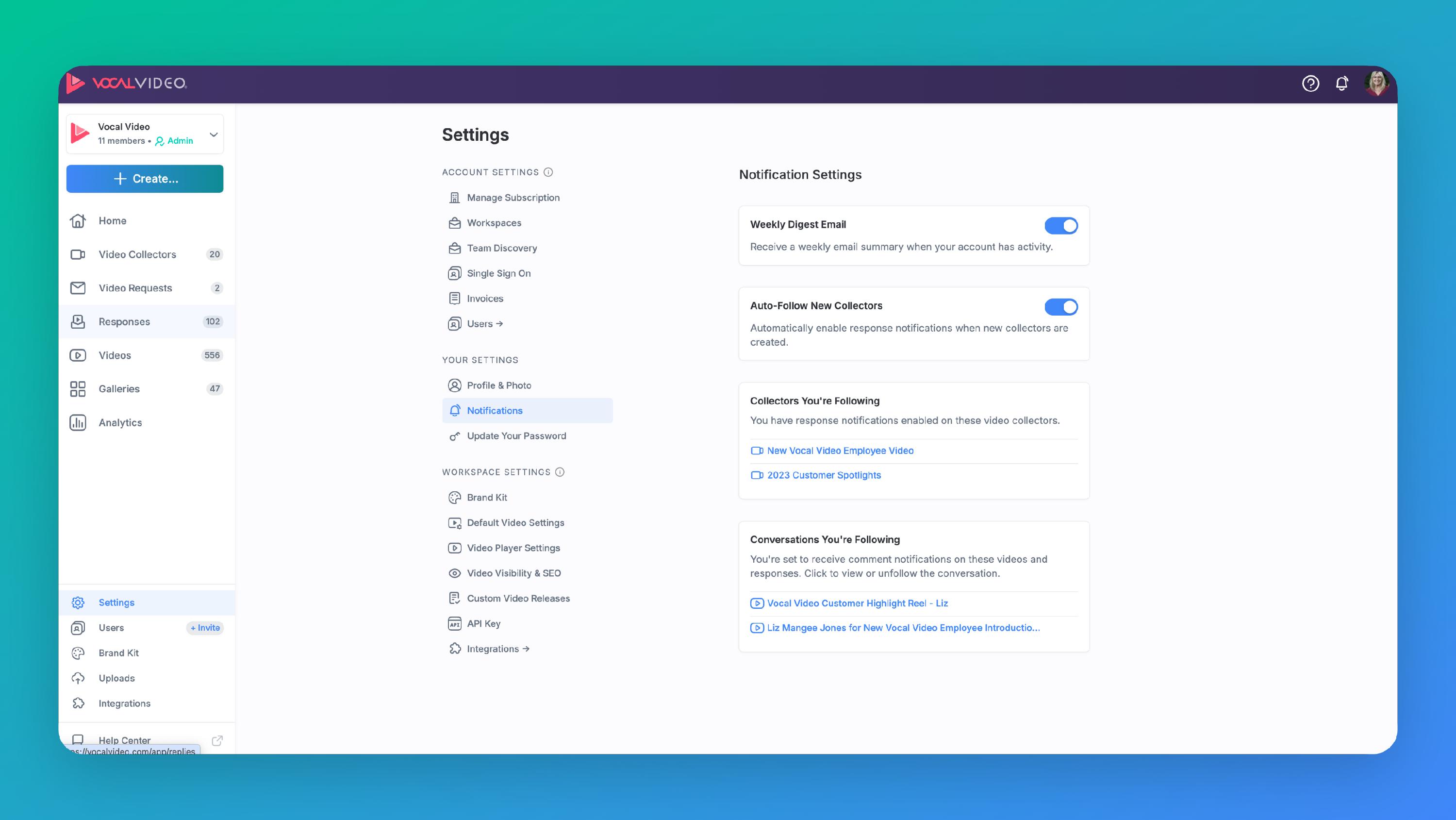 If you want to automatically be set to follow any new video collectors in a workspace, you can do so from your Notification Settings page (see below).