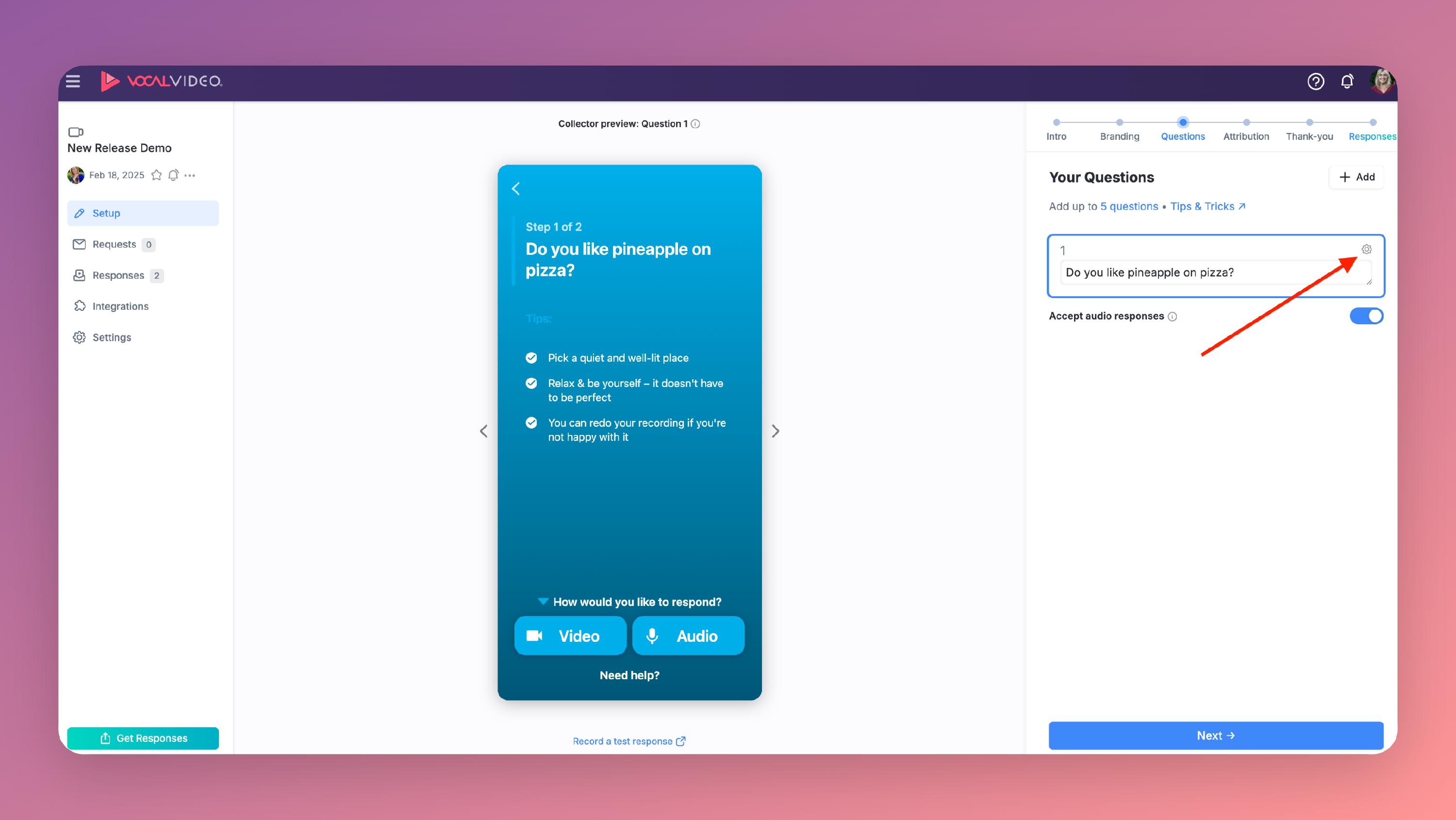 When you are setting up a video collector you can share a pre-written script or set of talking points for each question. This is a great option if there are certain ideas or points that you would like a respondent to mention in their response. The teleprompter response for each question must be set up individually.