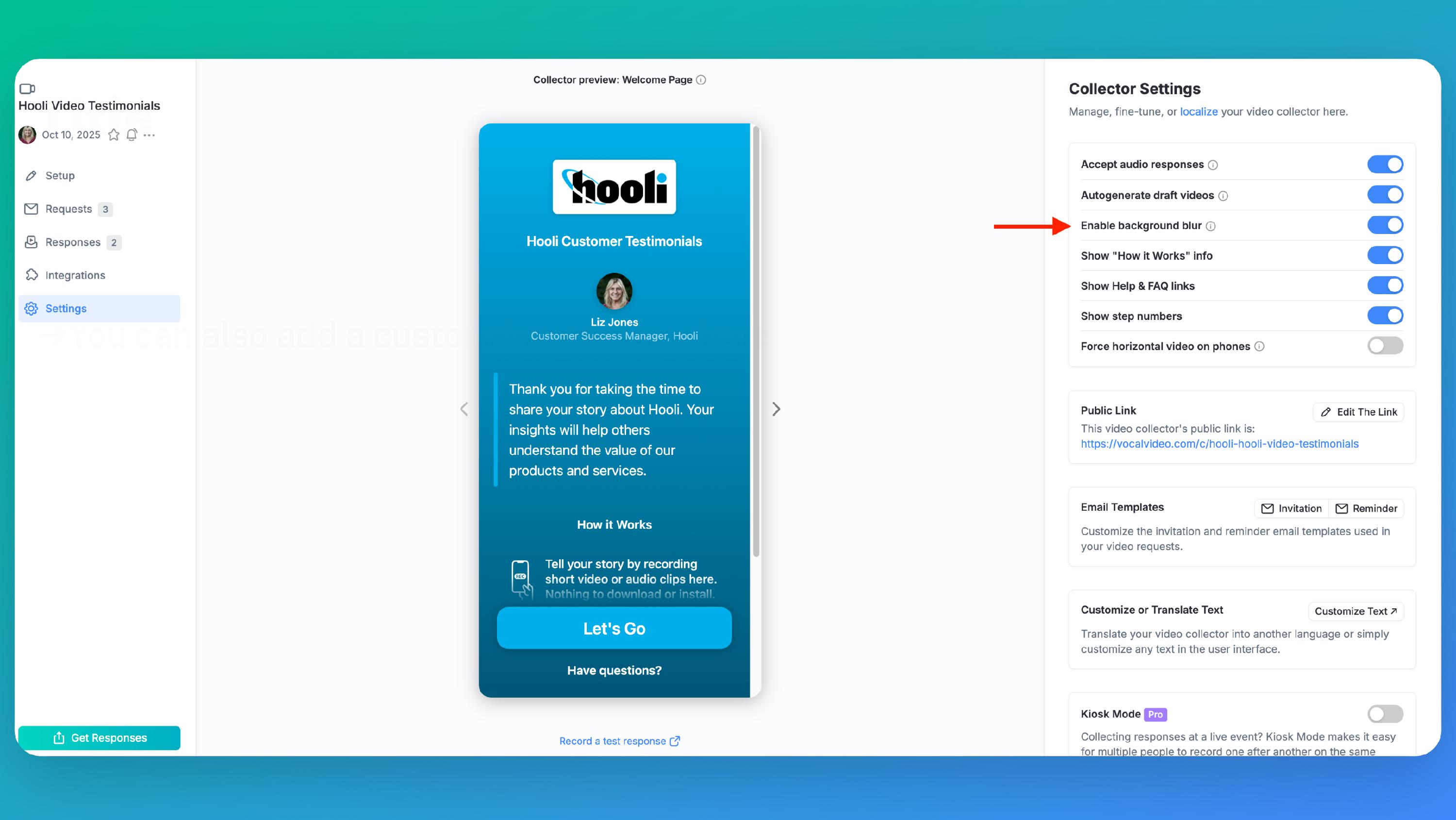 Vocal Video allows respondents to blur the background during recordings -- just like you can in Zoom or Google Meet. But Vocal Video also allows users to edit the background on already recorded videos in the editor. This guide will show you how to do both. AI Background Effects can help maintain privacy, reduce distractions, and add a professional touch to your videos.