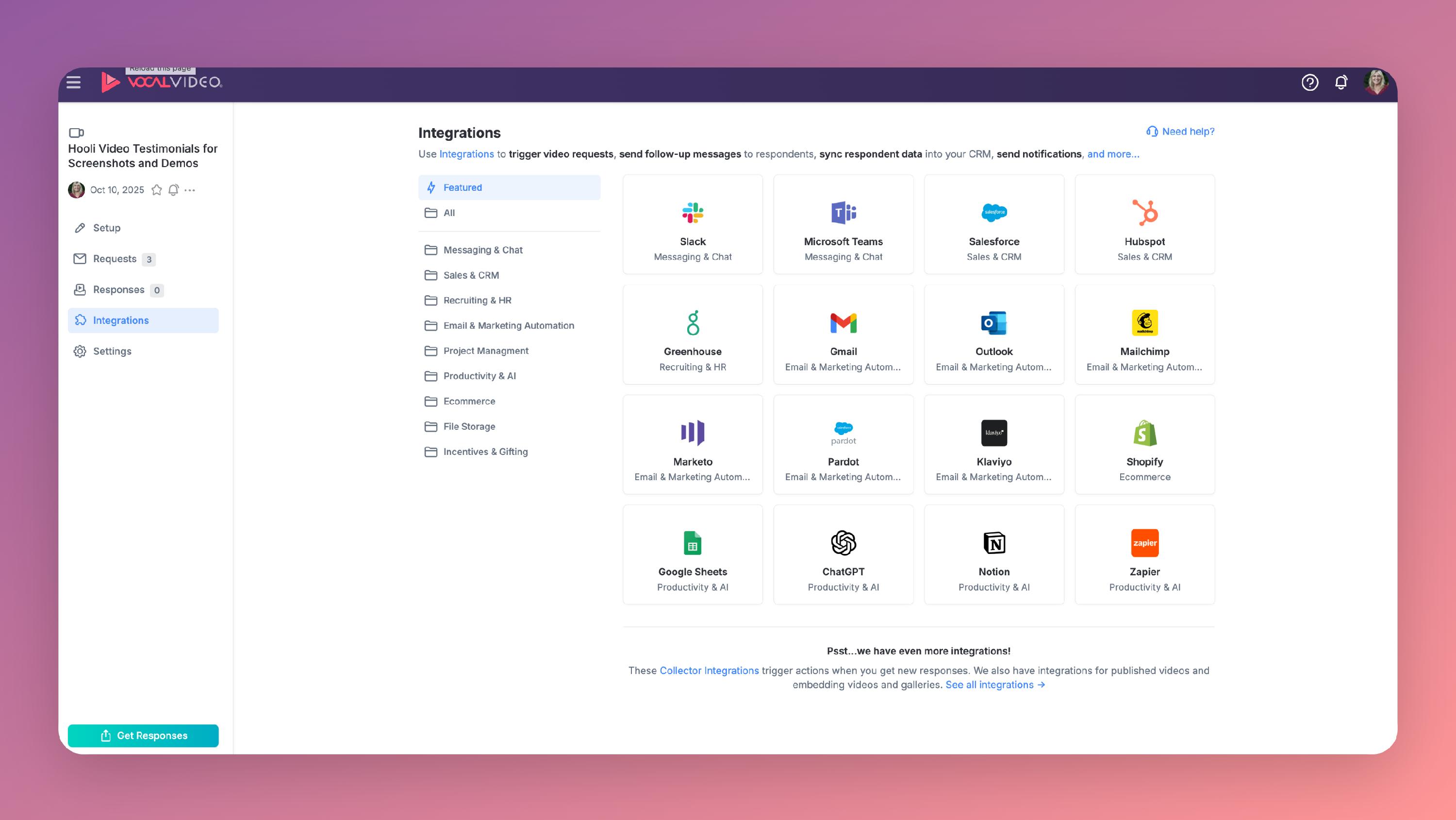 To make it even easier to trigger an action when a specific video collector gets a response, we built a subset of our integration directory into the video collector builder. We call these "collector integrations":