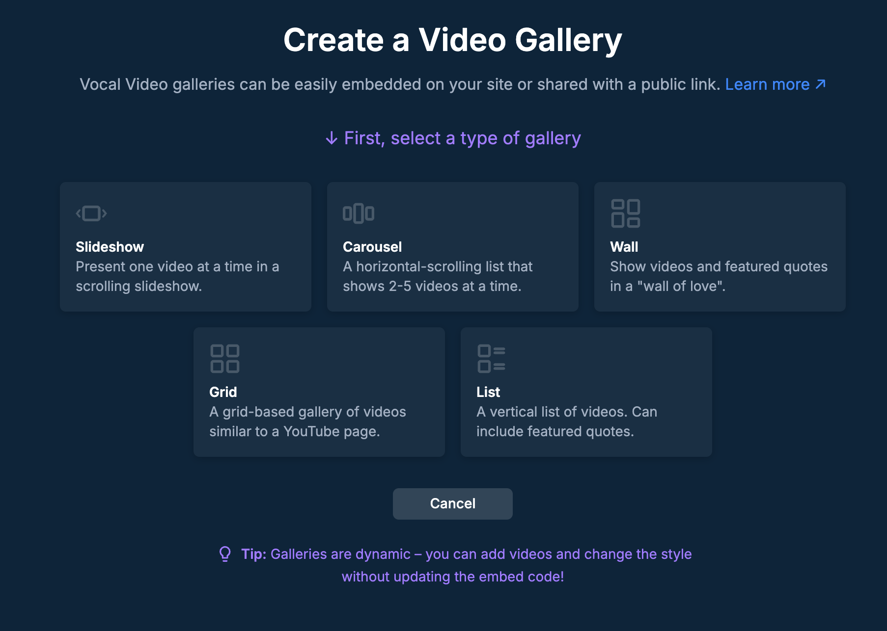 Video Galleries make it fast and easy to create beautiful collections of your published videos. These video collections are designed within Vocal Video, and can be easily embedded on your website or shared via a public page. We were inspired by how customers used our individual video embeds and shared other videos on their site, and we’ve made it possible for anyone to design video galleries - no web or video experience required.