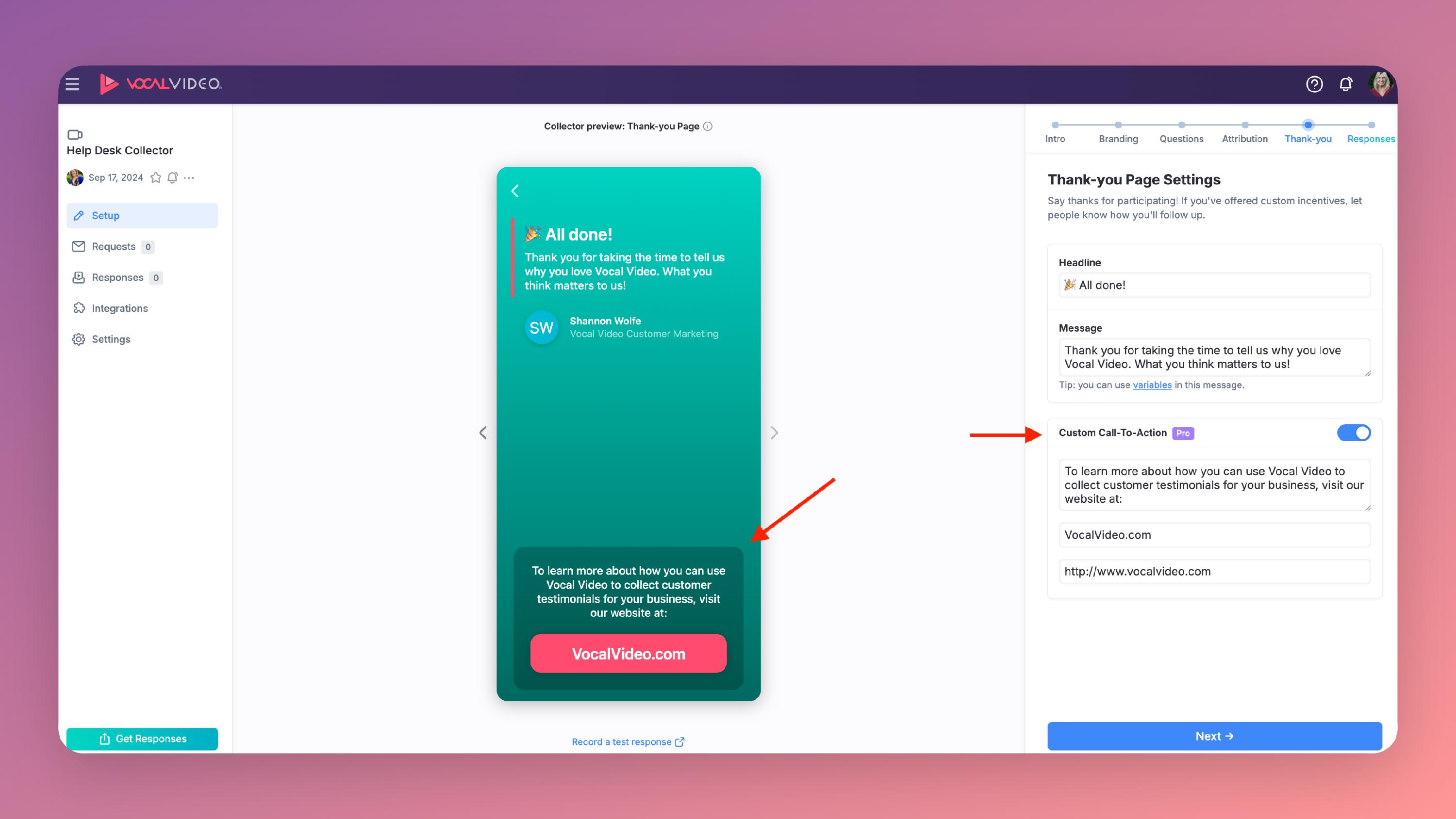 I want to add a Call to Action at the end of my Video Collector so that respondents click a link, sign a petition, or perform another action after answering my questions. Which plan should I pick? Our Pro and Enterprise plans allow you to add a Call to Action after your respondent finishes replying to the questions in your Video Collector. Learn more here: Call to Action Button.