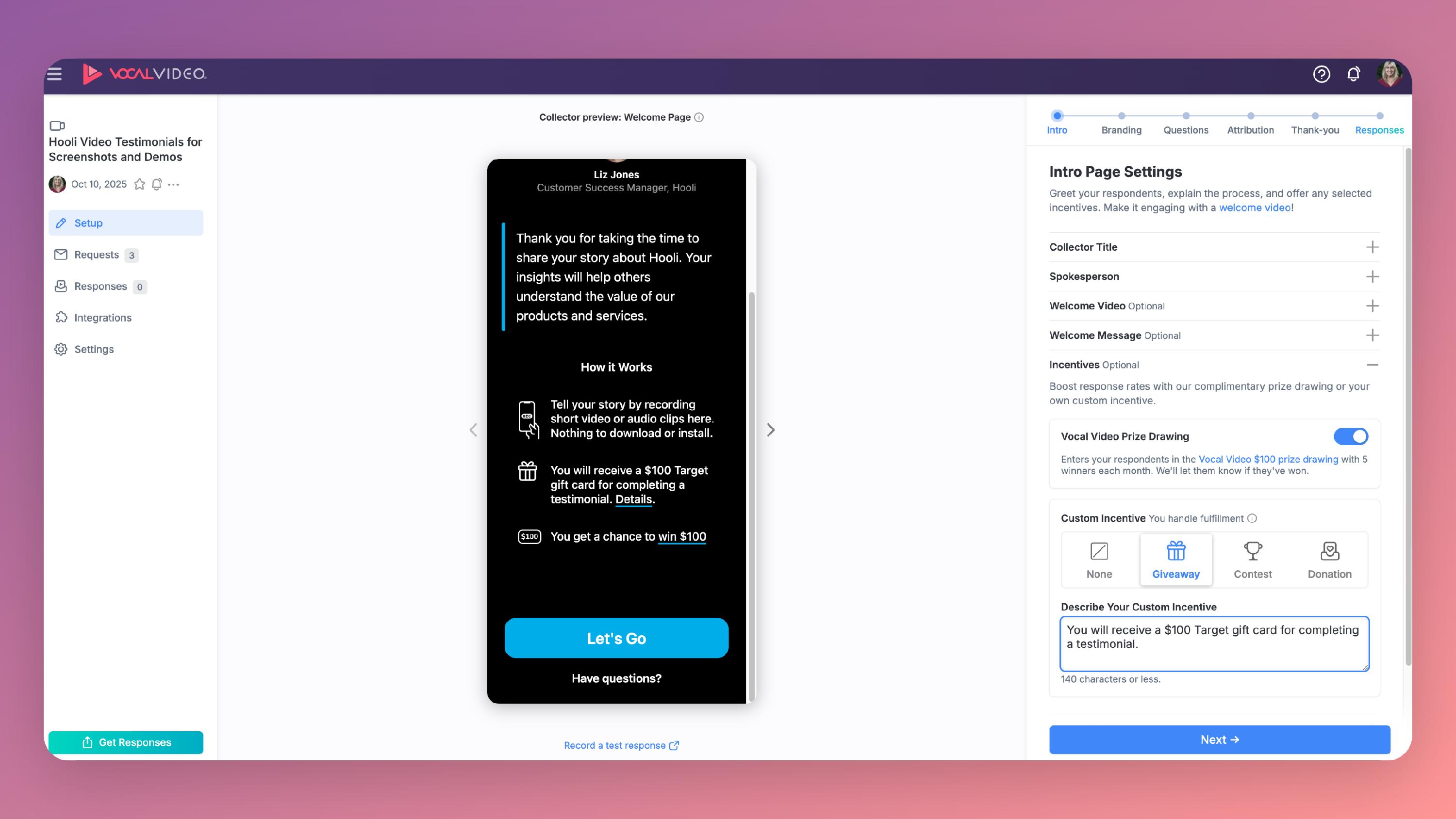 Customers, employees, or experts can be much more likely to respond to a request for a video review if you include an incentive in your Video Collector. You can customize incentives on the Welcome Page when you set up your Video Collector.